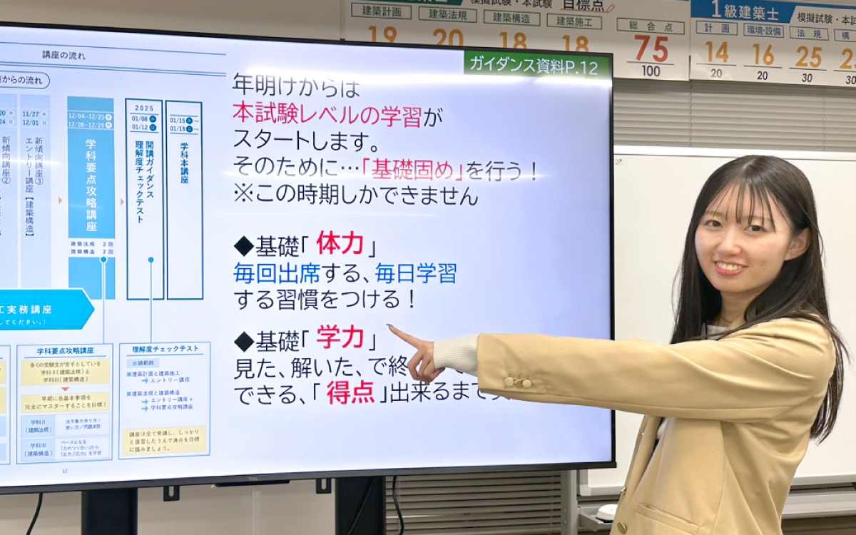 上司を含め先輩社員には、試験についての知識量・質では勝てない中でも、合格という結果を出せるように自分なりの強みを考えました。 先輩社員や同期に比べて担当受講生の数が少ないということはその分、一人あたりのフォローに時間をかけられる、自分の性格や雰囲気も生かして、受講生にとって話しやすい教務になろう、と考えました。積極的に授業中の教室巡回をし、授業終わりも必ず教室に入り、小まめに話しかけるように心掛けて、動きました。 とにかく早く顔と名前を覚え、用件がなくても、名前を呼んで自分から声をかけることを講習日は何よりも大事に、優先業務としていました。 支店内では基本静かなため、ぐいぐい声をかけに行く私をみて上司は驚いていました(笑) 決して無理をしていたというわけではなく、元々人と話すことは好きなことに加えて、純粋に『なんで建築士を目指そうと思ったの?』と今まで知らなかった世界に興味がありました。 中には入社1年目の私なんかよりも総合資格を知っている方や、試験についての知識を持っている方もちらほら。『こういう場合はどうやって声かけたらいいと思いますか?』と受講生にアドバイスをもらうこともありました。自分で考えたり、支店の先輩社員に聞いたりするよりも、実際に合格に向けて勉強されている受講生に『どうやって勉強しているんですか?』『何か意識していることあるんですか?』と教えてもらうことのほうが多かったです。私の上司もそうやって受講生に教えてもらいながら教務としての引き出しを増やしていったそうです。 また、業務的な話だけではなく、それ以外の会話も意識していました。アナウンスでは、合格に向けてあれやれ、これやれと色々と話をしていたため、個別の声掛けでは『先週より学習時間のびてますよね。』とか『テストの点数めっちゃ上がりましたね。』など小さい変化を見つけて、とにかく褒めてました。受講生からは「飴と鞭ですね」とツッコまれたこともあります(笑)「個別で話したら優しいのに…」と言われることもあったので、そういうメリハリはつけられたのではないかなと思います。 担当として挨拶してから1か月経つ頃には、受講生も私に心を開いてきてくれて、受講生から話しかけてくれたり、相談してくれたり、頼ってもらえるようになりました。
